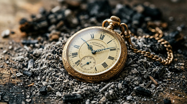 재 위에 놓인 1890년대 회중시계(AI 제작)