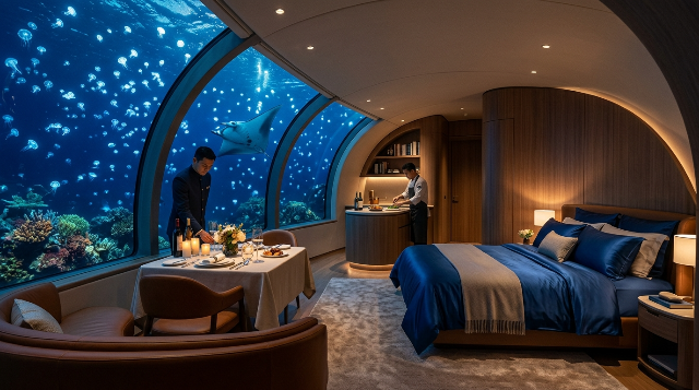 - 독점적인 경험: 침실의 거대한 통창을 통해 심해의 신비로운 풍경과 산호초, 수많은 해양 생물을 감상하며 잠들 수 있습니다. "세상 누구와도 섞이지 않고 지구에서 가장 고요한 곳에서 단둘이 있고 싶다"는 욕망을 실현해 주는 공간입니다.