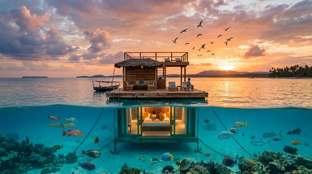- 경이로운 포인트: 옥상 데크에서는 별을 보고, 해수면 층에서는 식사를 하며, 수중층 침실에서는 360도 모든 방향에서 산호초 주변의 물고기들을 관찰할 수 있습니다. 밤에는 창밖의 조명이 물고기들을 유인해 더욱 환상적인 쇼를 연출합니다.