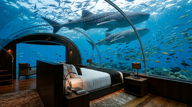 - 경이로운 포인트: 침실과 거실의 천장이 180도 곡면 아크릴로 되어 있어, 침대에 누우면 인도양의 푸른 바다와 산호초 사이를 유영하는 해양 생물들이 마치 나를 감싸 안은 듯한 환상적인 기분을 느끼게 합니다.