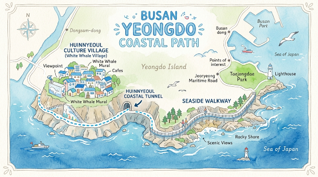 - 코스 정보: 흰여울해안터널 ~ 중리 해변 (약 3km, 1시간 30분 소요)