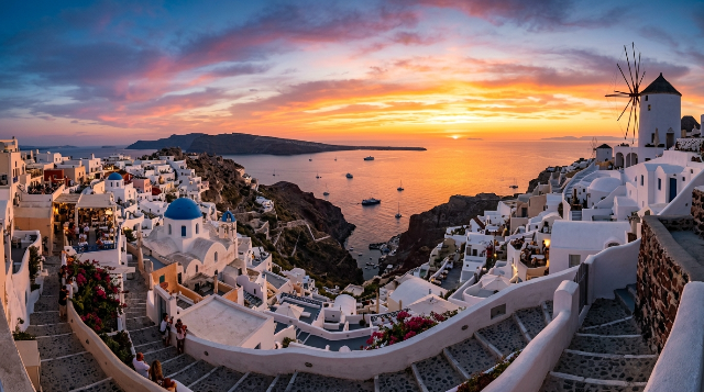 - 감성 포인트: 해가 수평선에 가까워질수록, 마을의 상징인 파란 돔(Blue Dome) 교회와 풍차들이 짙은 노을빛을 반사하기 시작합니다. 수천 명의 관광객이 모여있음에도 불구하고, 해가 완전히 넘어가는 순간 찾아오는 그 짧은 정적은 묘한 전율을 선사합니다.