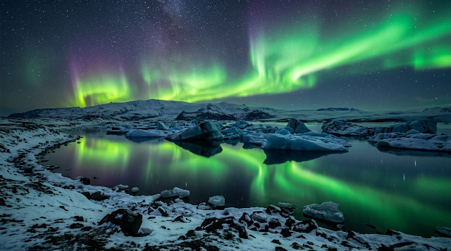 - 추천 스팟: 요쿨살론(Jökulsárlón) 빙하 호수. 호수 위로 떠다니는 빙하 뒤로 오로라가 나타나면, 수면 위로 빛이 반사되어 두 배의 감동을 줍니다.