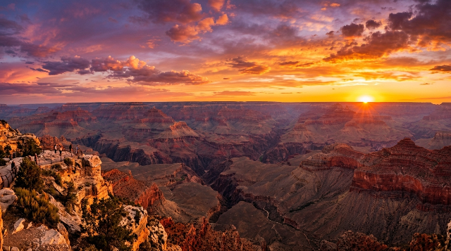 - 관전 포인트: 멀리 발아래 보이는 콜로라도강이 노을빛을 반사하며 가느다란 은색 실선처럼 반짝이는 모습을 찾아보세요.