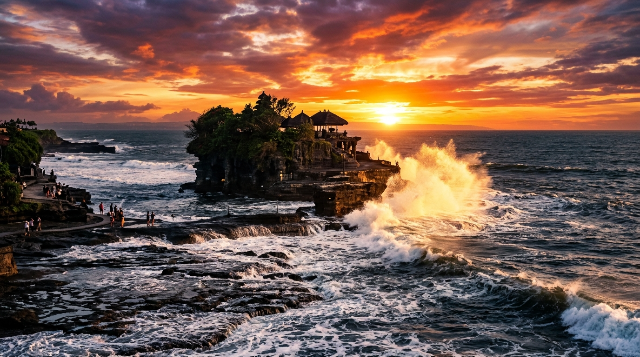 - 감성 포인트: 해가 수평선으로 가까워질수록 사원 뒤편의 하늘은 오렌지빛에서 짙은 핏빛으로 물듭니다. 이때 거친 파도가 바위에 부딪혀 하얀 포말을 일으키고, 그 포말마저 노을빛을 머금는 장면은 마치 한 폭의 역동적인 유화 같습니다.