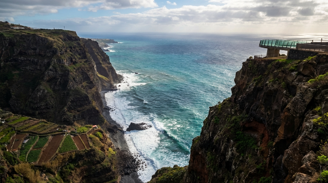 - 카보 지랑(Cabo Girão): 유럽에서 가장 높고 세계에서 두 번째로 높은 해안 절벽(580m)입니다. 절벽 끝 투명한 스카이워크에 서면 발밑으로 부서지는 대서양의 파도가 마치 지구가 살아있음을 온몸으로 증명하는 듯한 전율을 줍니다.